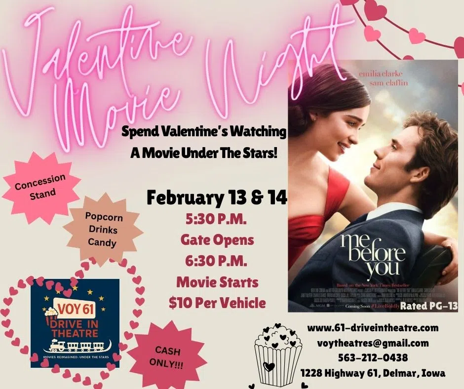 The Voy 61 Drive In Theatre, located south of Maquoketa, is set to host a special “pop up” weekend for Valentine’s Day. This marks the first time in 76 years that the theater will open for Valentine’s, offering a unique experience for film lovers. On February 13 and 14, audiences can enjoy the classic romcom “Me Before You.” The gates will open at 5:30 p.m., and the movie will start at dusk, around 6:30 p.m.