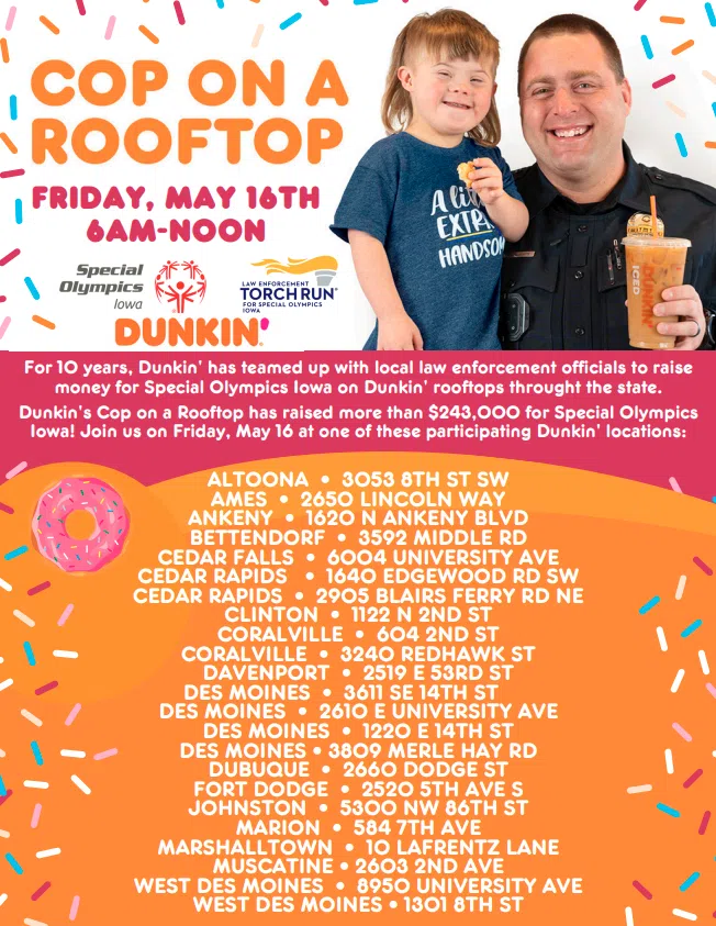Join us for the 10th Annual Law Enforcement Torch Run (LETR) Dunkin’ Cop on a Rooftop fundraiser at any participating Iowa Dunkin’ location!